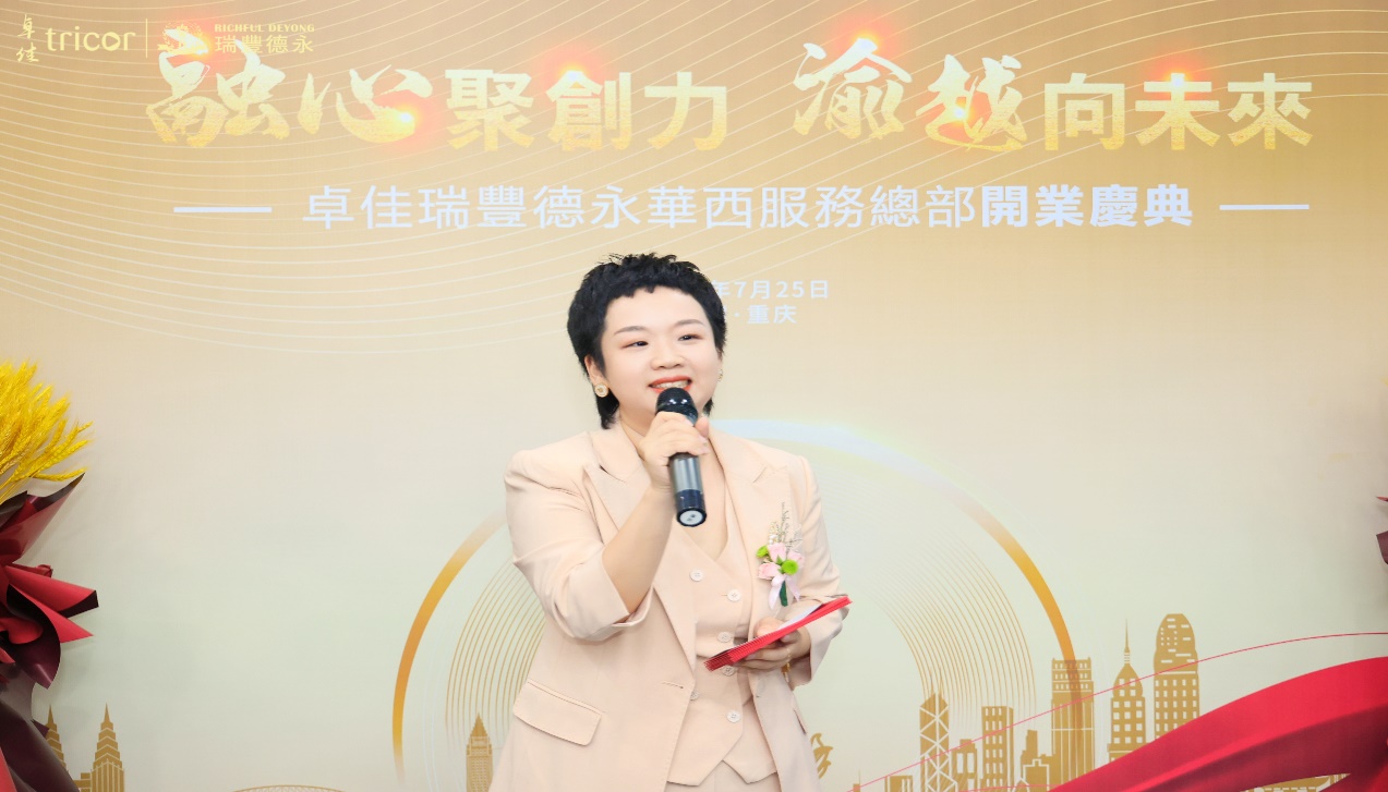 卓佳瑞丰德永华西区域总经理张春莉女士发表了热情洋溢的欢迎词,她表达了对广大客户与合作伙伴的感恩,并表示华西服务总部的成立,将一如既往地践行“为客户创造更高价值,为行业树立品牌典范”的核心价值观和“致力于每一位客户的满意和成功”的服务宗旨,务实为中西部企业的国际化发展积极拓展价值版图。
