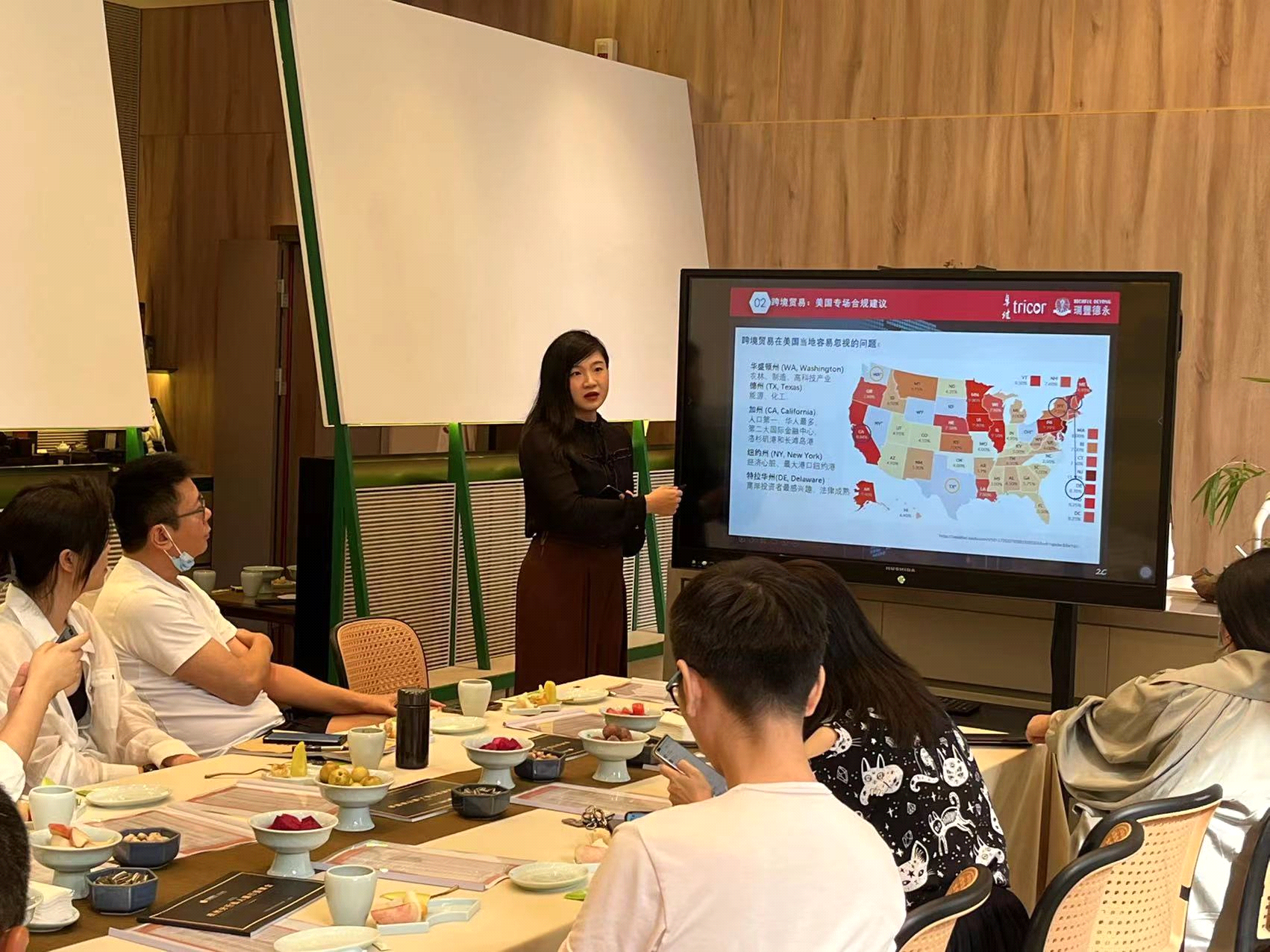 本次研讨会得到了宁波银行杭州分行的大力支持以及来自各行各业知名企业家的积极响应。会上,主讲嘉宾之一的卓佳瑞丰德永杭州公司资深客户经理施伊涵女士以美国为例,针对跨境合规运营及跨境财税规划等问题,详细讲解了多种跨境业务架构搭建的可行性及优劣势,并辅以实际案例,进一步强调了合规运营的重要性。另外,她还分析了传统跨境贸易与跨境电商经营中的常见问题,并提出了具有针对性的建议,为美国公司后续健康发展提供了多样化的选择。