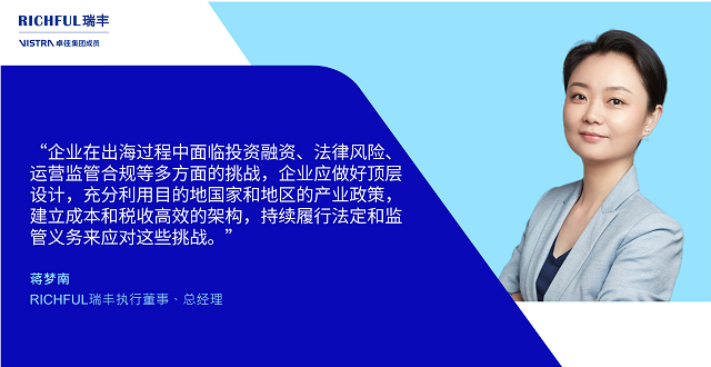 除了金融服务,企业出?;剐杩悸嵌喾矫嬉蛩?。RICHFUL瑞丰执行董事、总经理蒋梦南与《中国经营报》记者分享,企业在出海过程中面临投资融资、法律风险、运营监管合规等多方面的挑战,企业应做好顶层设计,充分利用目的地国家和地区的产业政策,建立成本和税收高效的架构,持续履行法定和监管义务来应对这些挑战。
