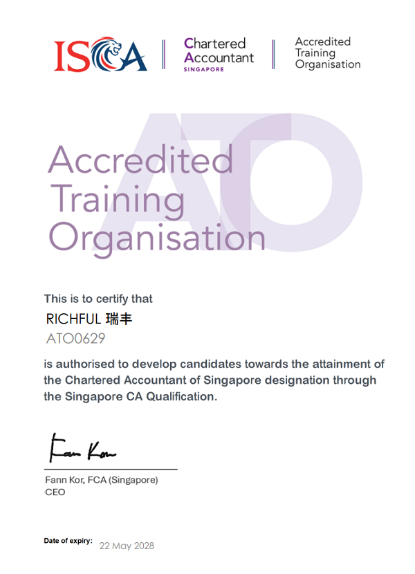 近期,RICHFUL瑞丰通过新加坡特许会计师协会(The Institute of Singapore Chartered Accountants, ISCA)审核,正式获得“认证培训雇主”(Accredited Training Organisation, ATO) 资格。该资质表明RICHFUL瑞丰在会计人才培养体系及专业实践机制上符合ISCA国际标准,为企业深化国际化人才战略奠定基础。