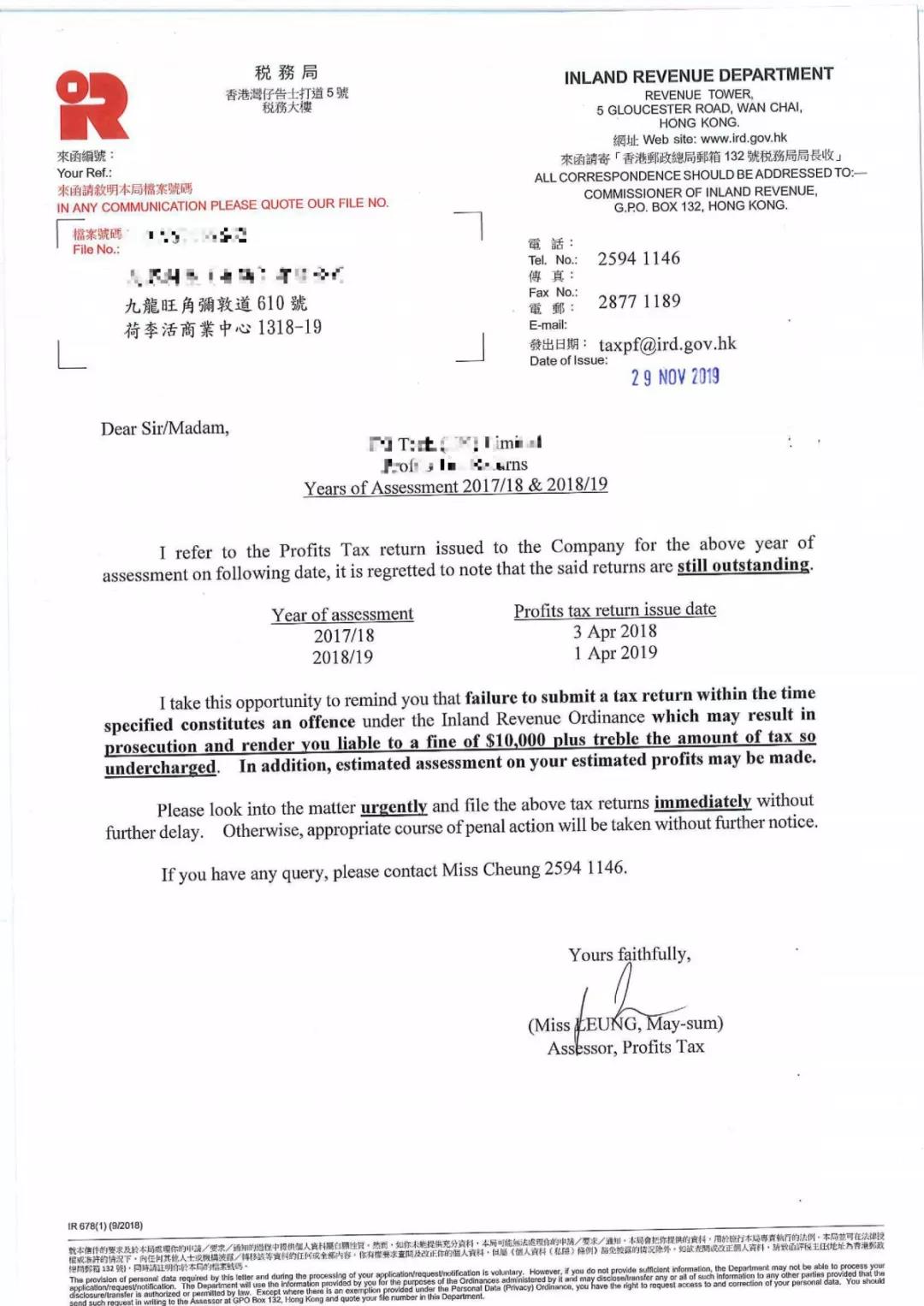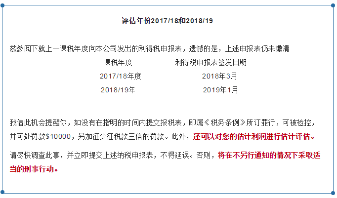 同时,截止12月尚未申报的公司,香港税局也陆续开始下发通牒信函(如图所示),公司将可能面临高额??罴捌浪埃医星恐瓶鬯?!