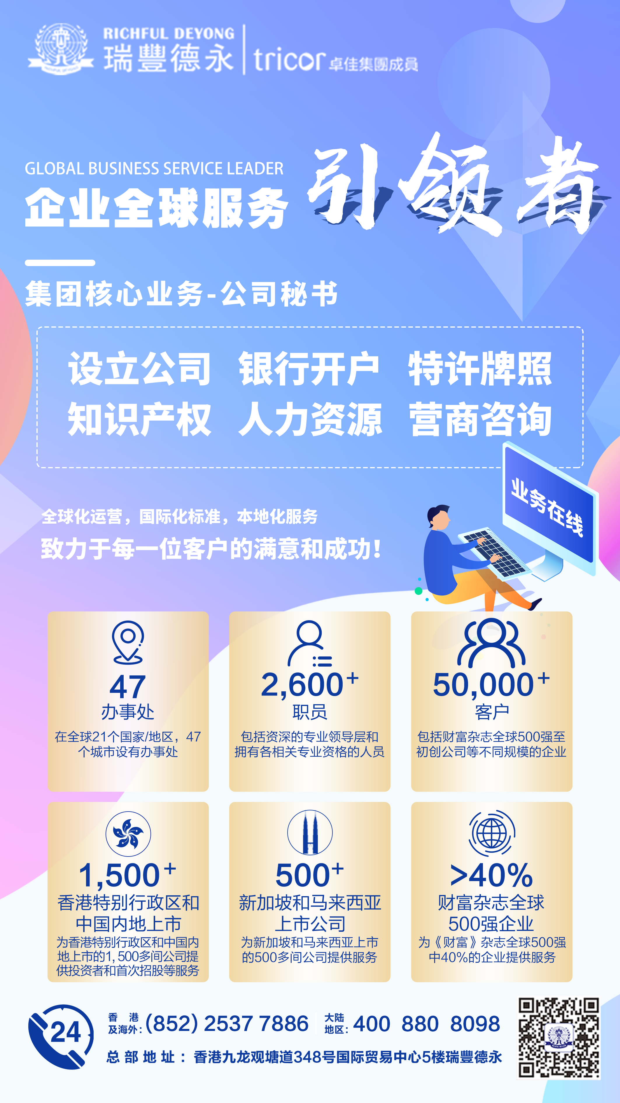 香港公司的秘书服务公司不仅是法定存在,而且在香港的运营和维护中也起着重要作用。作为公司与政府之间的纽带,秘书服务公司可以及时处理政府的函件和相关事件,并可以处理香港公司的年检,换领商业登记证,制作年度报告。报告并提交,代缴各项政府登记费等费用。
