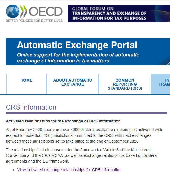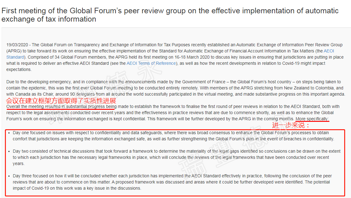 在2020年3月,为了加强税务、信息交换透明度,OECD全球论坛成立了一个自动信息交换对等审查小组(APRG),用来监督100多位加入CRS协议的国家和地区是否落实AEOI标准。