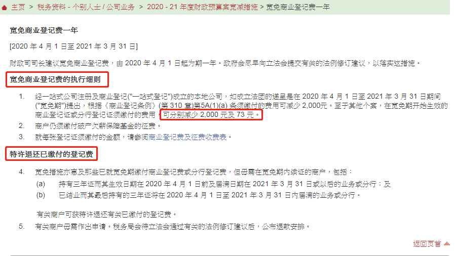 同时税务局于4月1日发布通知,宽免公司商业登记费(特许退还已缴费的登记费),为期1年。如成立法团的递呈是在2020 年 4 月 1 日至 2021 年 3 月 31 日期间(“宽免期”)提出,根据《商业登记条例》(第 310 章)第 5A(1)(a) 条须缴付的费用可减少 2,000 港元。