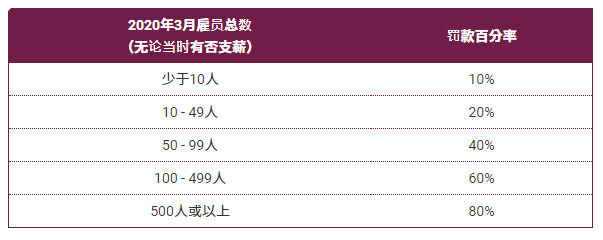 ??畎俜致适前垂椭饔?020年3月的雇员总数多少(无论当时有否支薪)订定,即雇员人数愈多,罚款百分率愈高: