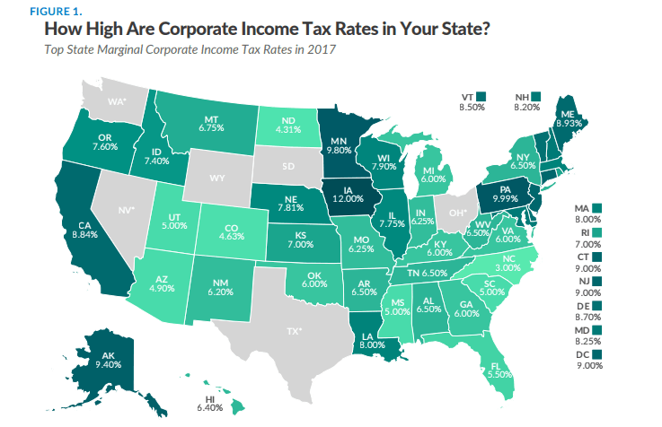 44个州征收企业所得税。税率从北卡罗莱纳州的3%到爱荷华州的12%。