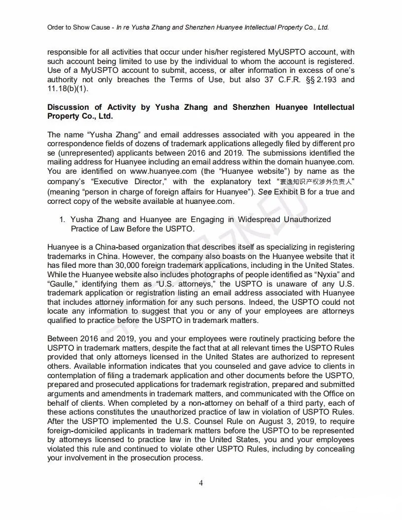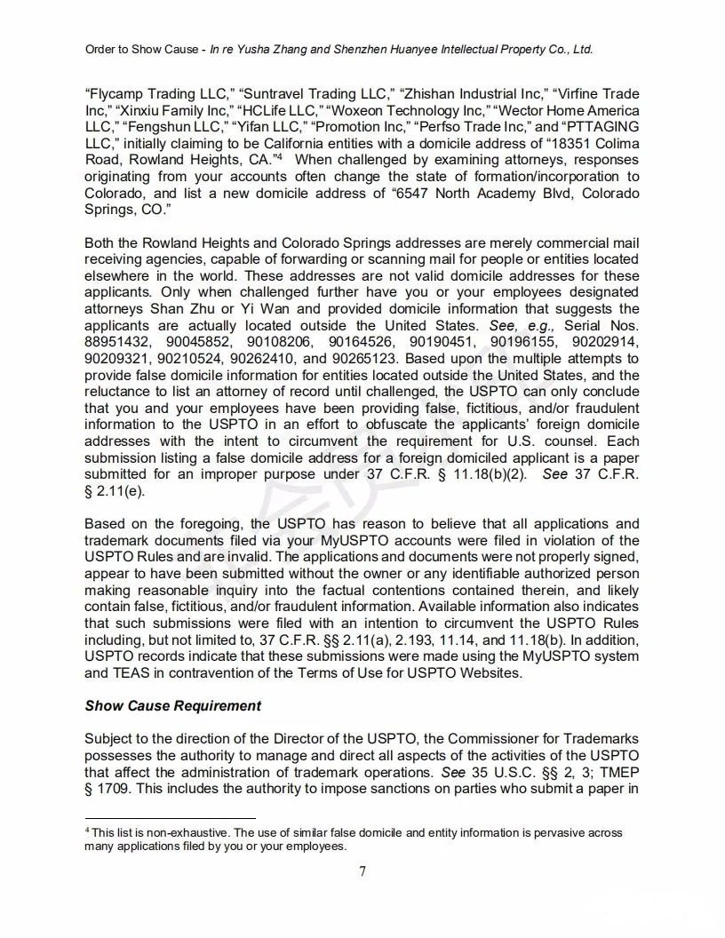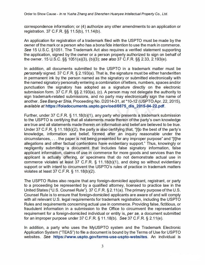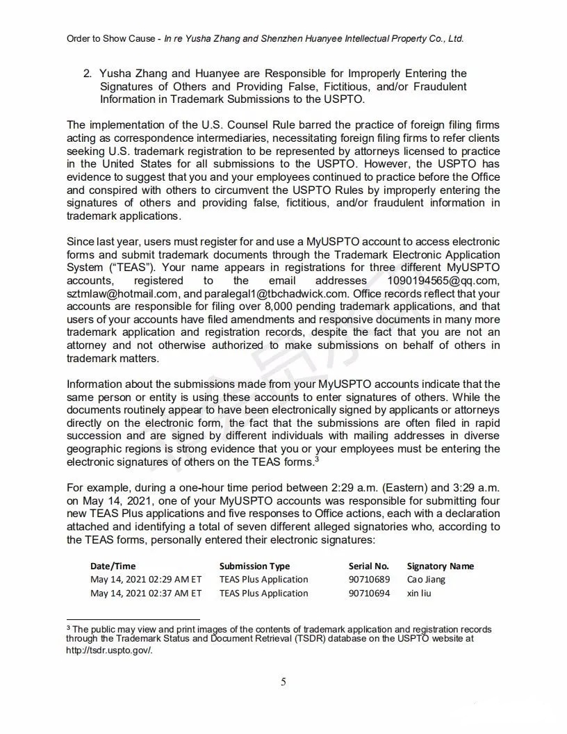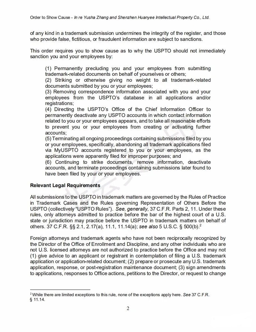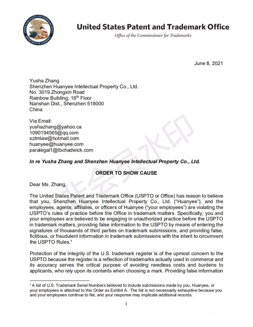 2021年6月8日,美国专利商标局(USPTO)向中国深圳一家知识产权公司的代表人发出一份123页的“ORDER TO SHOW CAUSE”。对该公司代理提交的批量美国商标的行为,尤其是其中涉及到第三方签名提供虚假、虚构和欺诈信息的行为提出质疑,要求该公司提出合理的理由,并在美国东部时间6月22日下午5:00前进行回复。否则USPTO将会对该代理机构以及代表人进行制裁。