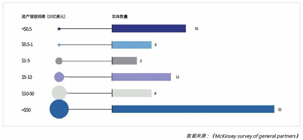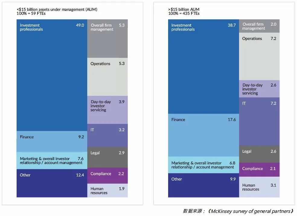 当基金发展到—定规模时,中后台运营复杂性会影响私募基金整体运营效率。根据麦肯锡的调研报告《 McKinsey survey of general partners》 (见下图),当被问及”How private equity is tackling operational complexity?" 根据受访者的回答,当资产管理规模小于150亿美元时,运营成本占总成本的 16.7%;而当资产规模大于150亿美元时,运营成本占总成本的比例增至26.9%。私募股权基金在运营、人力资源和合规方面存在规模不经济的现象(即在管基金生产规模扩大到—定程度后,收益增加的幅度小于规模扩大的幅度)。在私募股权行业,资产管理规模较大的基金总体不如规模较小的基金运营效率高。