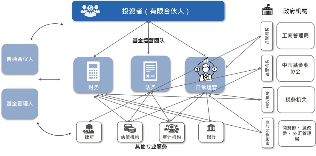 基于私募股权的业务特点,运营的复杂性与业务参与密切相关。从私募基金的组织架构来看,基金设立及后续运作中,需协调GP与LP之间,以及不同LP之间的利益诉求,兼顾各个主体所在行业之间的合规要求。从投资运作,项目的选定与资金的投出以至整体基金运作均对内外联动有较高要求,运营团队需保证基金的日常运作合规,向投资者负责。同时,与律所、估值、审计与银行均产生密切的业务交集。从整个行业出发,私募股权基金的运作将必须在各监管机构的执行要求框架之下进行。