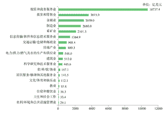 2022年,中国对外直接投资涵盖了国民经济的18个行业大类,其中流向租赁和商务服务、制造、金融、批发零售、采矿、交通运输等领域的投资均超过百亿美元。