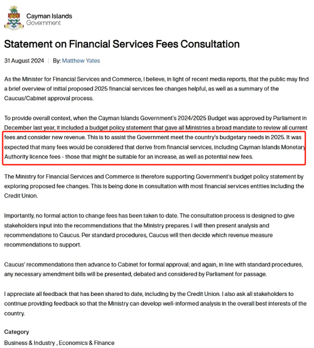 开曼群岛政府近日发布咨询文件,建议于2025年1月1日起调高所有开曼群岛公司的政府牌照费用。关于费用调整的原因,开曼群岛金融服务部的解释中提到:“为了帮助政府满足2025年的预算需求,将通过探索拟议费用变更来支持政府的预算政策声明,许多来自金融服务的费用将被考虑,包括开曼群岛金融管理局的许可费,可能适当增加的费用,以及潜在的新费用。因此,将对开曼群岛公司年费费用进行调整,以弥补增加的服务交付成本。“