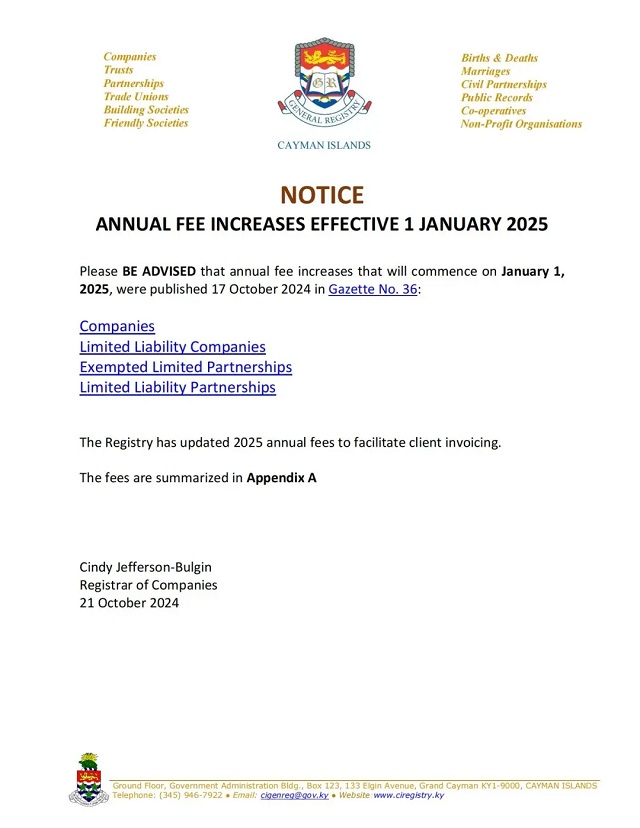 根据开曼群岛金融服务部于2024年10月21日正式发布的公告,随着《公司法》(2024年附表5 修正案),《有限责任公司(费用)》(2024年修正案),《豁免有限合伙企业(第2号)实施细则》(2024年修正案),《有限责任合伙企业(费用)实施细则》(2024年修正案) 等一系列修正案在政府宪报刊登,公司、有限责任公司、豁免有限合伙企业和有限责任合伙企业的年费变更将于2025年1月1日正式生效。