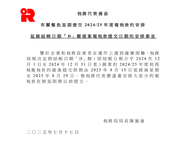 香港税务局于2025年7月17日发布通告,鉴于企业与税务服务机构的年底结账操作困难,??正式延长D类公司(财务年度结束于2024年12月1日-31日)的利得税申报期限??——由原定的2025年8月15日延后两周至??2025年8月29日??。本次延期旨在缓解申报压力,但需注意??8月29日为最终截止日??,逾期将面临合规风险。