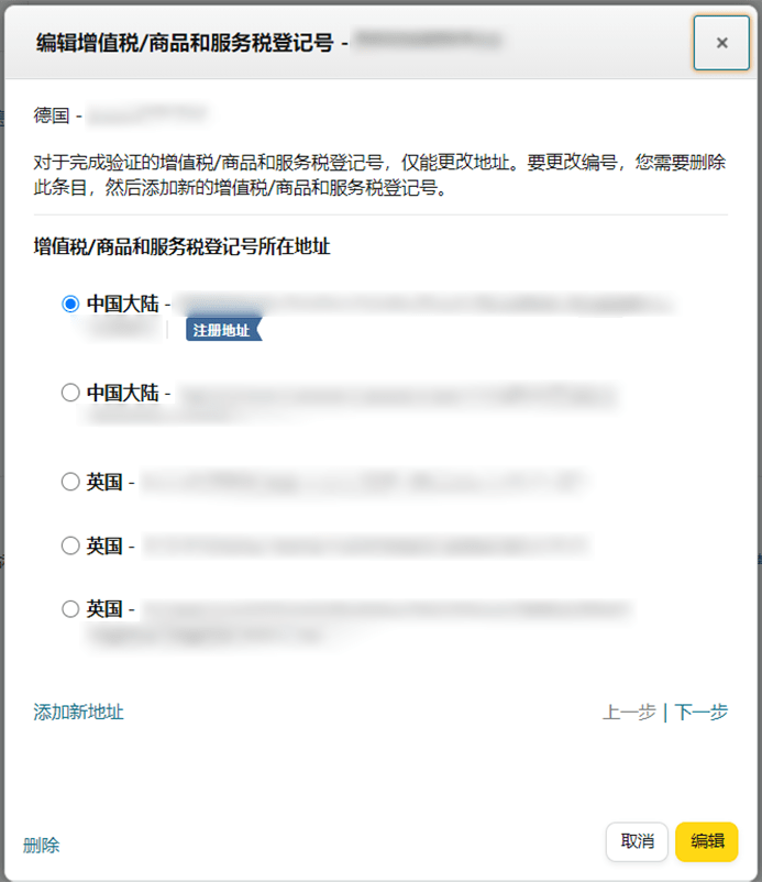 ② 单击关联的增值税税号旁边的“编辑”按钮;