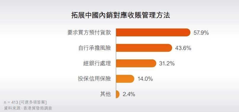 对于如何妥善管理内销的应收账款,有57.9%受访企业表示会要求买方预付货款,43.6%则会自行承担风险。另一方面,31.2%会经银行处理有关应收账款,及14.0%会投保信用保险。也有小部分(其他:2.4%)表示没有或不知道有甚么方法管理应收账。