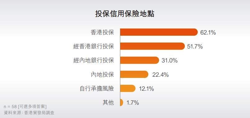 在有投保信用保险的企业当中,不少企业通过两个或以上地点投保。当中,大部分企业通过香港直接投保(62.1%),51.7%则经香港银行投保,也有31.0%经内地银行投保、22.4%直接在内地投保等,也有少数表示会到海外投保(其他:1.7%)。