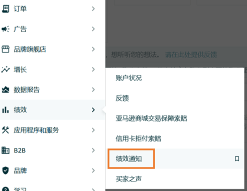 1、登录亚马逊卖家平台,通过路径“绩效 > 绩效通知”进入绩效通知页面。