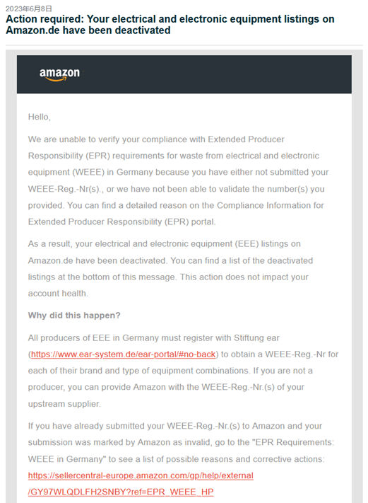 根据欧盟的生产者责任延伸(EPR)政策规定,所有销售到德国的电子产品都必须符合德国电气与电子设备废料指令(WEEE)的要求。因此,自2023年7月1日起,亚马逊会全面停售不满足WEEE合规要求的商品。如果卖家正在申请注册WEEE,但号还没下来该怎么办呢?