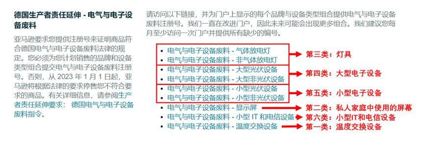 进入亚马逊合规门户,依次点开9个设备类别,查看是否所有提交入口均已提交WEEE注册号,并且均显示“有效”。