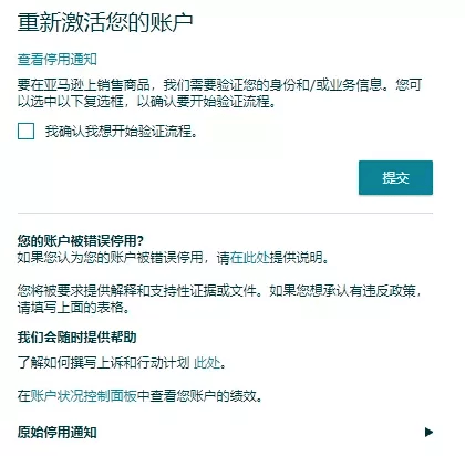 如下图,点击“重新激活您的账户”,勾选“我确认我想开始验证流程”后提交,即可进入申诉流程啦!当您点击“提交”后,亚马逊后台工作人员会就您的资料进行二次审核,之后您就会收到相关提醒,确认您的申诉是否通过。