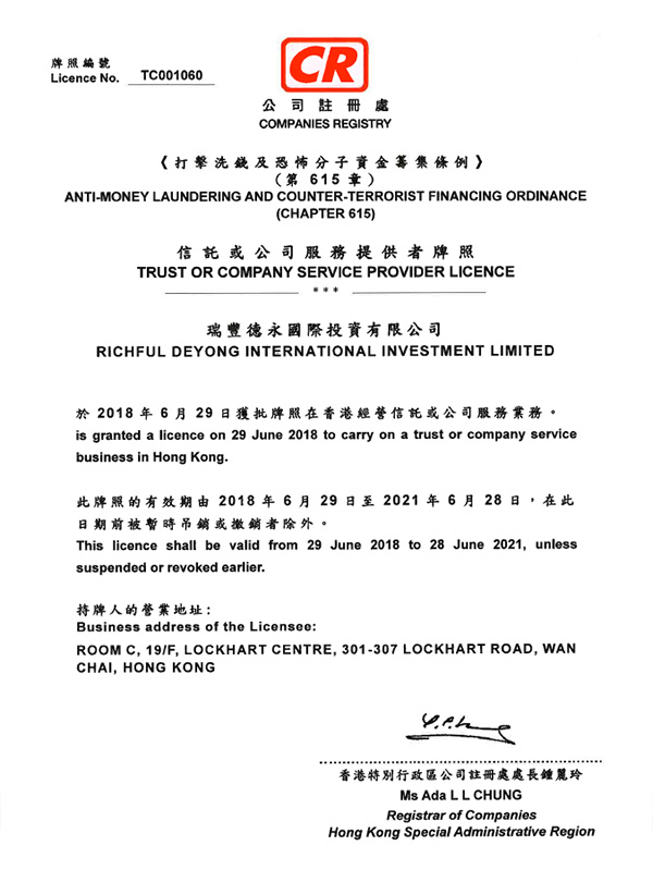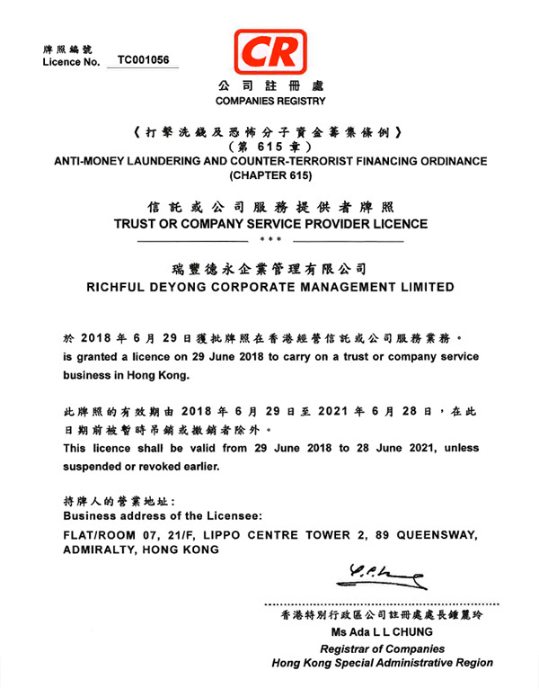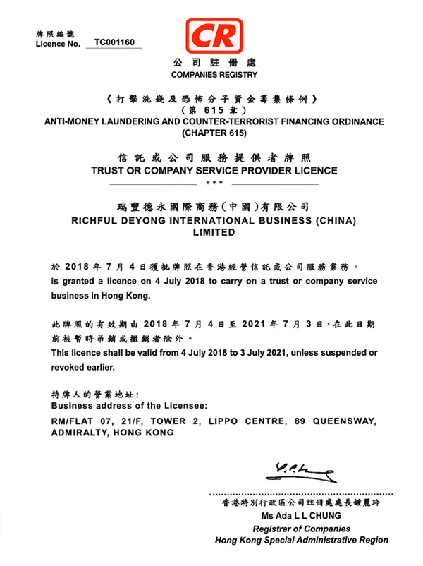 瑞丰德永 【信托或公司服务提供者牌照】 三张牌照 香港公司注册处查册: